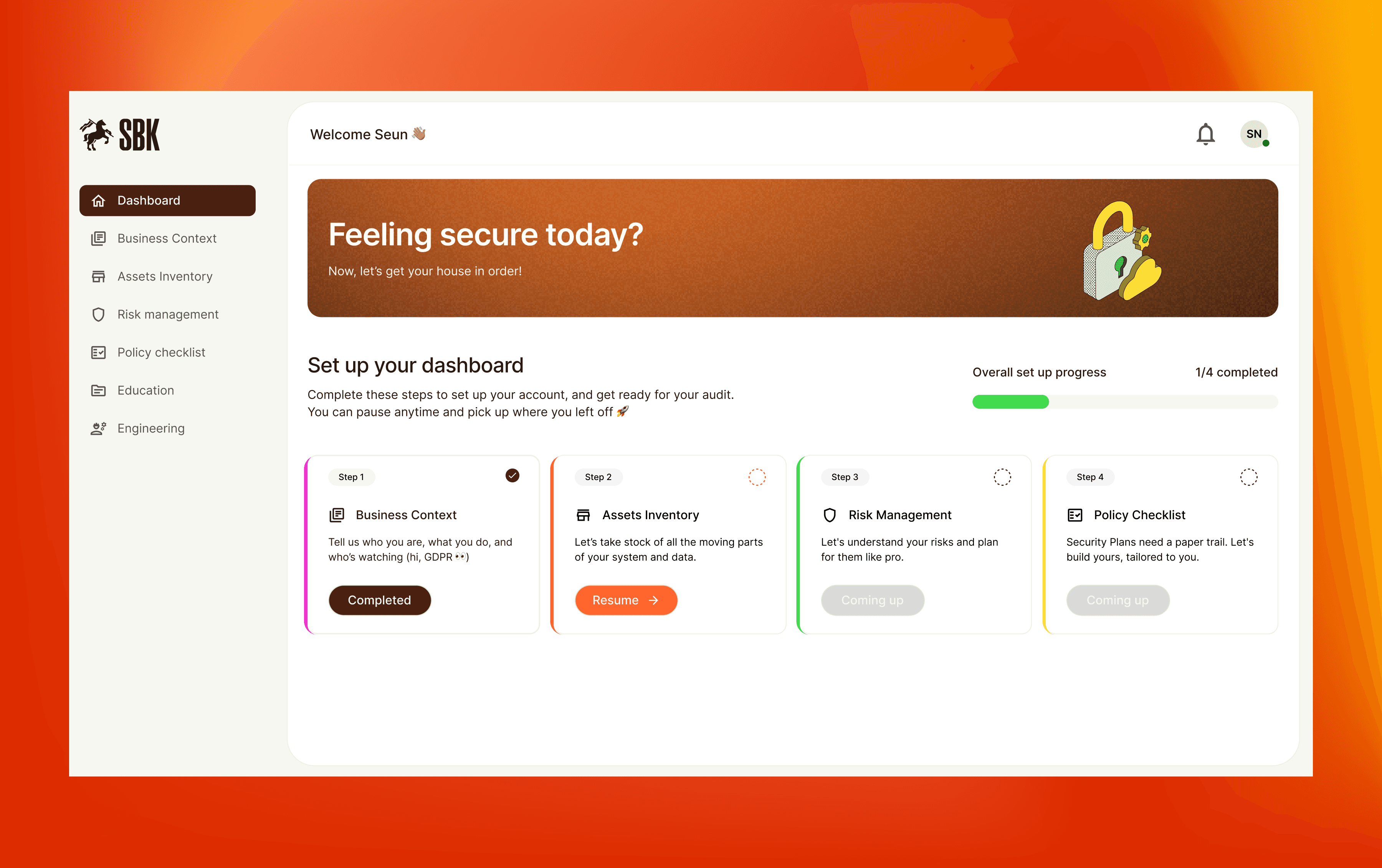 A compliance platform helping startups prepare for security audits. I designed the dashboard and workflows for managing assets, policies, and risks.